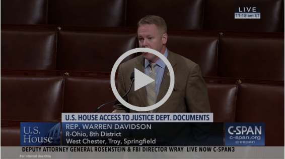 WASHINGTON, DC - Today, Congressman Warren Davidson took to the House floor in support of individual privacy rights guaranteed by the Fourth Amendment of the U.S. Constitution. Davidson spoke in support of H.Res. 970, the Department of Justice Compliance Resolution, which insists that the Department of Justice fully comply with requests, including subpoenas, of the House Intelligence and Judiciary Committees relating to potential violations of the Foreign Intelligence Surveillance Act (FISA).